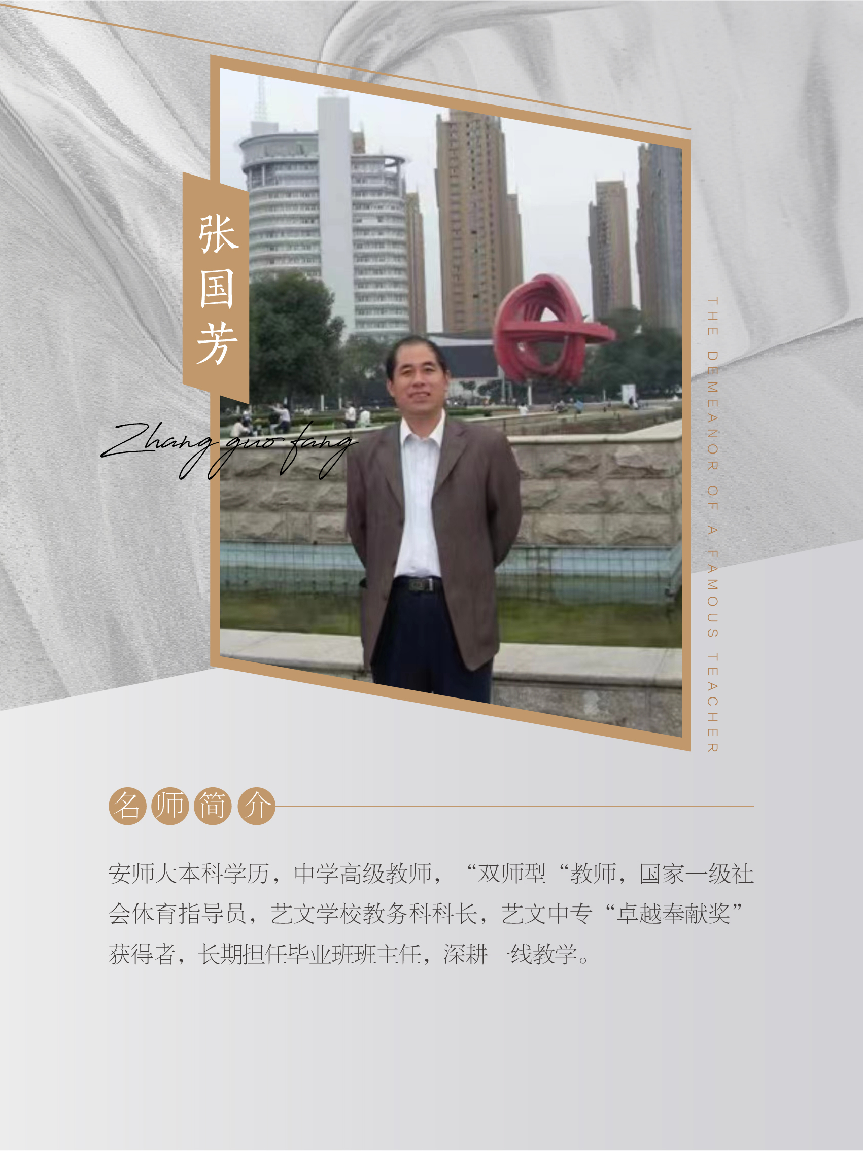 張國(guó)芳,安師大本科學(xué)歷,中學(xué)高級(jí)教師,“雙師型“教師,國(guó)家一級(jí)社會(huì)體育指導(dǎo)員,藝文學(xué)校教務(wù)科科長(zhǎng),長(zhǎng)期擔(dān)任畢業(yè)班班主任,深耕一線教學(xué),有《東漢政權(quán)“不抑兼并”原因探析》等多篇論文獲市級(jí)獎(jiǎng)項(xiàng),其中《中學(xué)歷史板書設(shè)計(jì)》被《農(nóng)村孩子報(bào)》收編發(fā)表,人物傳記《劉備》被《中國(guó)歷史名人傳略》收錄。