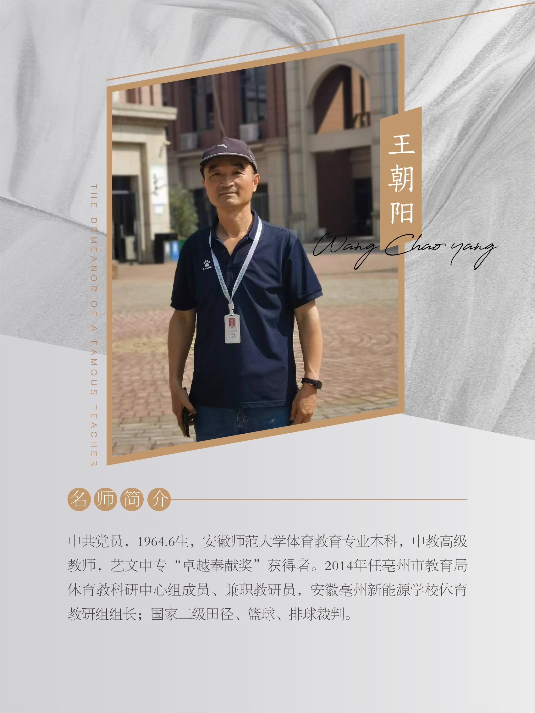 王朝陽(yáng)老師2023年從安徽亳州新能源學(xué)校退休,滿懷對(duì)教育事業(yè)的熱愛,加入宿州市藝文中等專業(yè)學(xué)校,擔(dān)任體育課教學(xué)至今,承前啟后傳幫帶,為國(guó)家培養(yǎng)體育專業(yè)人才。