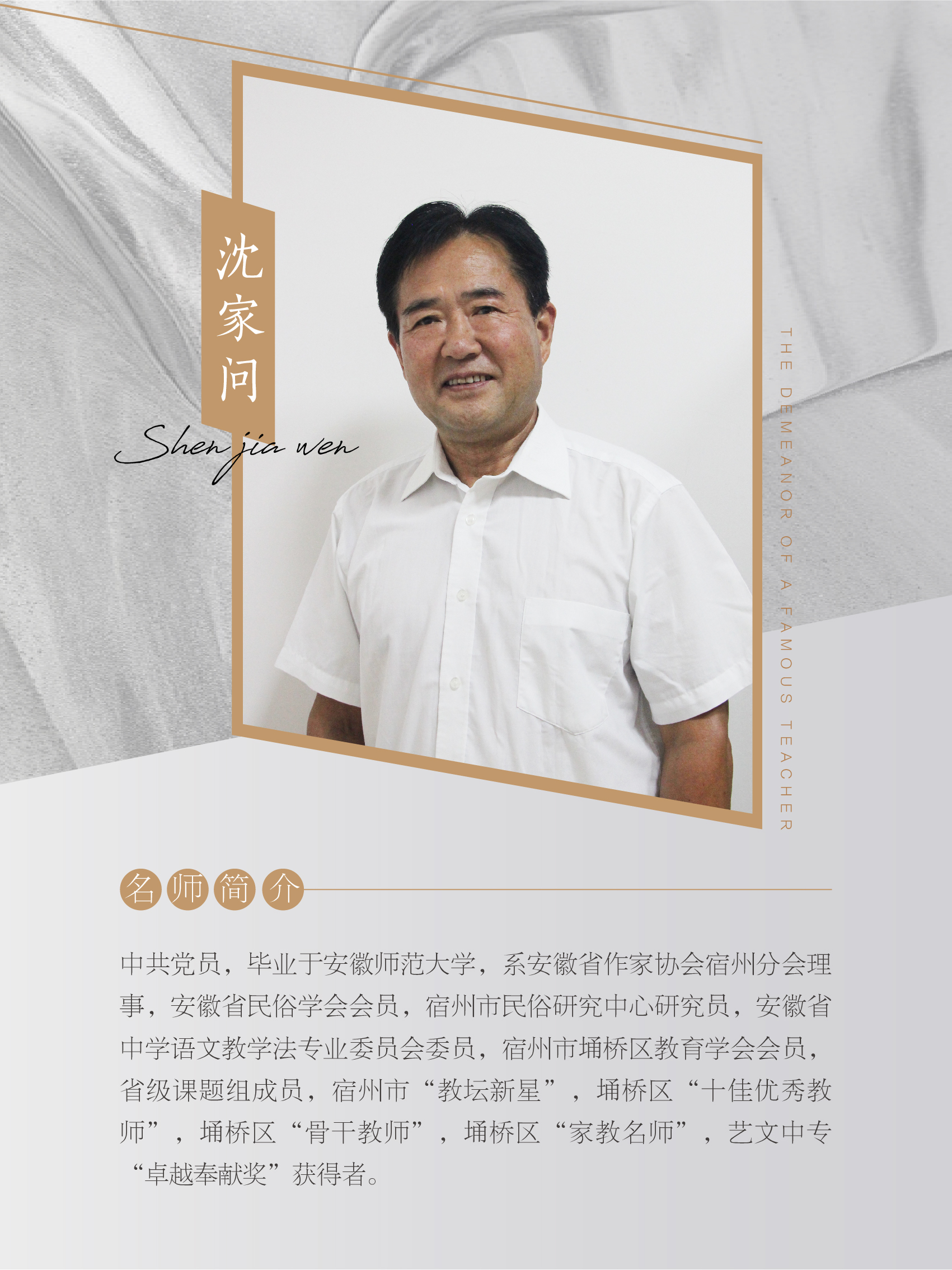 作為一名教師,在平凡的崗位上,他耕耘著一份赤誠(chéng),播撒著一腔熱血,收獲著一份希望與感動(dòng)。教書育人,無(wú)私奉獻(xiàn),是他畢生的追求。從教四十年,他多次被評(píng)為先進(jìn)教師、優(yōu)秀黨員,曾獲得全國(guó)“教科研先進(jìn)個(gè)人”、全國(guó)“基礎(chǔ)教育課程改革先進(jìn)個(gè)人”、宿州市“教壇新星”,埇橋區(qū)“十佳優(yōu)秀教師”等稱號(hào),發(fā)表文學(xué)作品、教育教學(xué)論文二十余萬(wàn)字,三次獲得政府文學(xué)獎(jiǎng)。他,就是沈家問(wèn)老師。