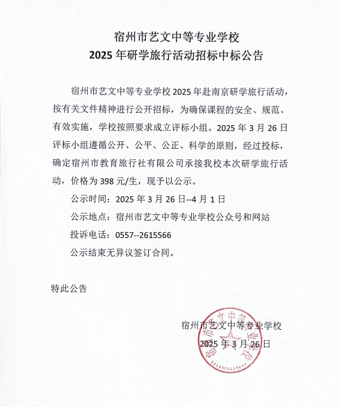 宿州市藝文中等專業(yè)學校2025年研學旅行活動招標中標公告