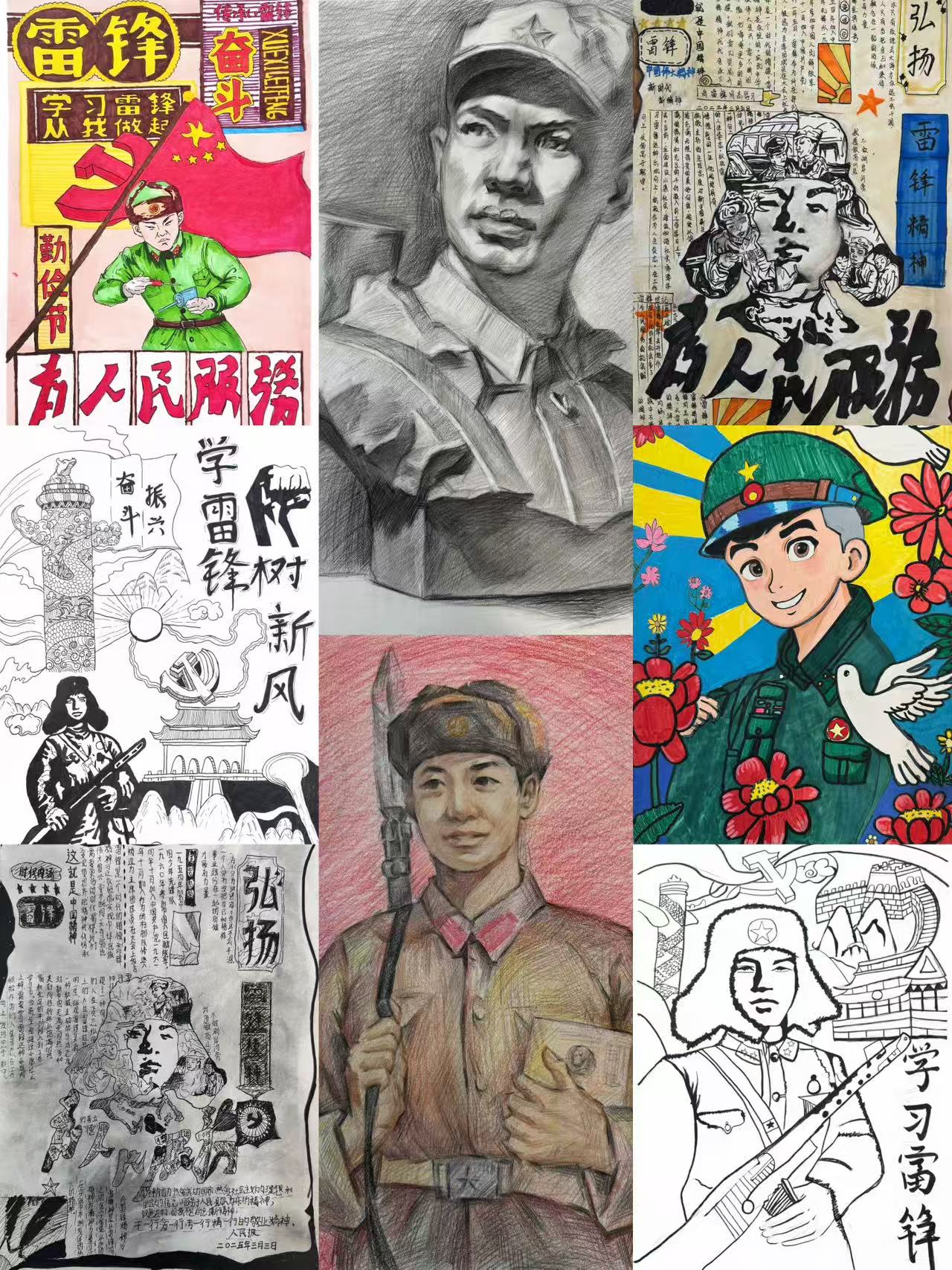 美術(shù)組發(fā)起的“鋒行畫(huà)卷”主題創(chuàng)作大賽,圍繞“雷鋒故事”“身邊微光”“公益行動(dòng)”三大方向,激發(fā)學(xué)生創(chuàng)作熱情。200余件作品涵蓋素描、剪紙、彩繪等形式,以細(xì)膩筆觸展現(xiàn)雷鋒事跡、捕捉生活溫暖瞬間。這些作品在校園內(nèi)形成藝術(shù)長(zhǎng)廊,師生駐足欣賞,讓大家在藝術(shù)的熏陶中深化對(duì)雷鋒精神的理解。
