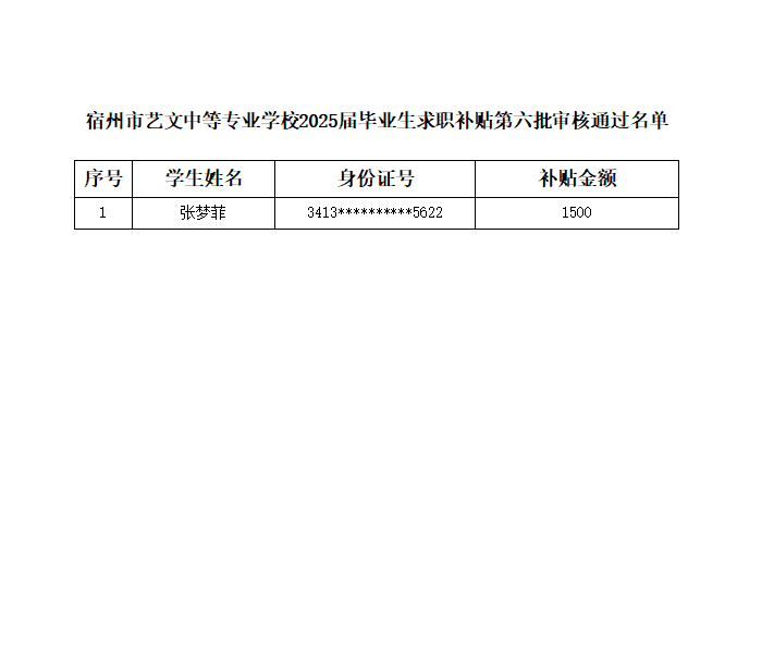 宿州市藝文中等專業(yè)學(xué)校2025屆畢業(yè)生求職補(bǔ)貼第六批審核通過名單公示根據(jù)安徽省人力資源和社會(huì)保障廳、安徽省教育廳、安徽省民政廳、安徽省財(cái)政廳、安徽省農(nóng)業(yè)農(nóng)村廳、安徽省殘疾人聯(lián)合會(huì)聯(lián)合下發(fā)《關(guān)于做好2025屆困難畢業(yè)生求職補(bǔ)貼信息化發(fā)放工作的通知》,宿州市藝文中等專業(yè)學(xué)校開展2025屆困難畢業(yè)生求職補(bǔ)貼信息化發(fā)放工作。經(jīng)學(xué)生自愿申請,系統(tǒng)審核,以下1名畢業(yè)生通過第六批次審核,現(xiàn)將審核通過名單(見附件)進(jìn)行公示。公示時(shí)間為2025年5月12日至2025年5月16日。公示期間,如有異議,請與招生就業(yè)辦公室聯(lián)系反饋。 招就辦聯(lián)系電話:0557-2615566 市人社局監(jiān)督舉報(bào)電話:0557-3052424